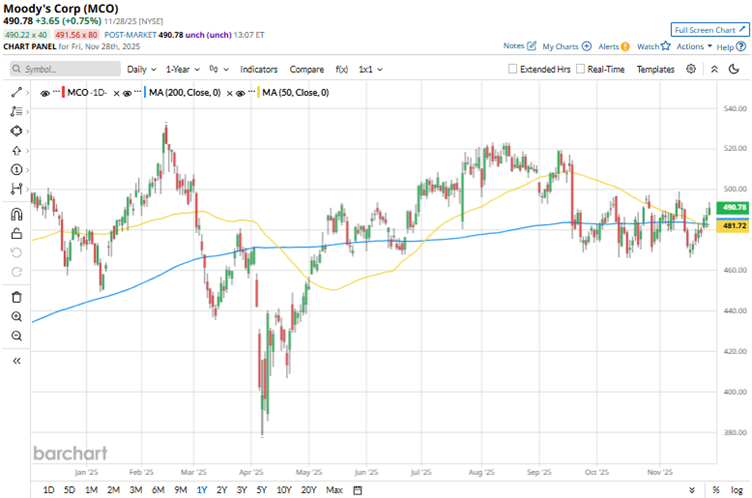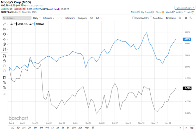 The company’s shares had reached a 52-week high of $531.93 back in February and a 52-week low of $378.71 in April. Reflecting broader market volatility and sector-specific concerns, Moody’s stock has declined by 3.7% over the past three months. On the other hand, the broader Dow Jones Industrial Average ($DOWI) is up 4.6% over the same period. Therefore, the stock has underperformed during this period.