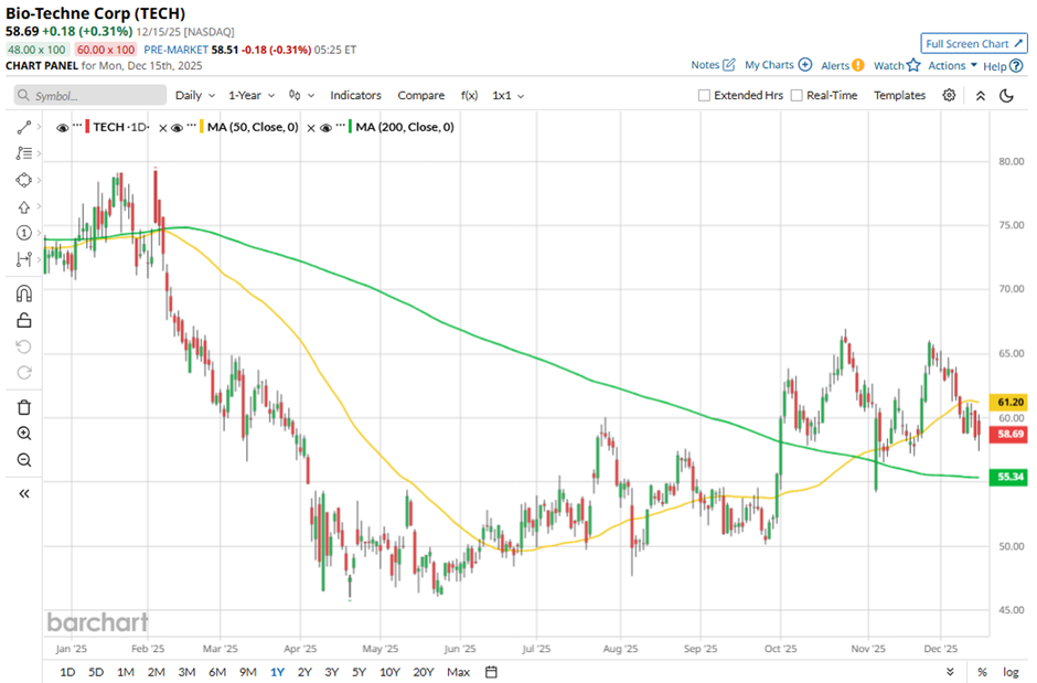 With a market cap of $9.1 billion, Bio-Techne Corporation (TECH) is a global life sciences company that develops, manufactures, and sells reagents, instruments, and services for research, diagnostics, and bioprocessing markets. The company operates through two segments: Protein Sciences and Diagnostics and Spatial Biology.