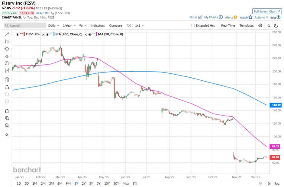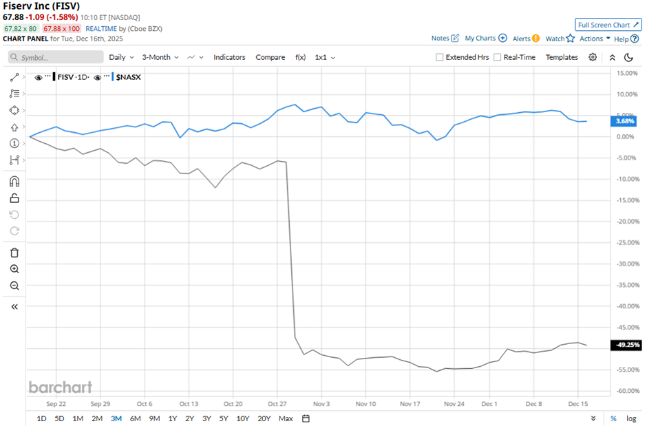 Fiserv shares tumbled over 44% on Oct. 29 after the company reported weaker-than-expected Q3 2025, with adjusted EPS of $2.04 and revenue of $4.92 billion. The selloff deepened after Fiserv sharply cut its full-year outlook for a second straight quarter, slashing revenue growth expectations to 3.5% - 4% from 10% and lowering adjusted EPS guidance to $8.50 - $8.60.
