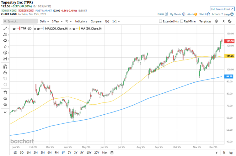 Over a more extended period, this outperformance persists. Over the past 52 weeks, Tapestry’s stock has gained 95.5%, while it has been up 56.6% over the past six months. By contrast, the Consumer Discretionary Select Sector ETF has increased by 3.4% and 15% over the same periods, respectively. Tapestry’s shares have consistently traded above its 200-day moving average over the past year and have been above its 50-day moving average since early December.