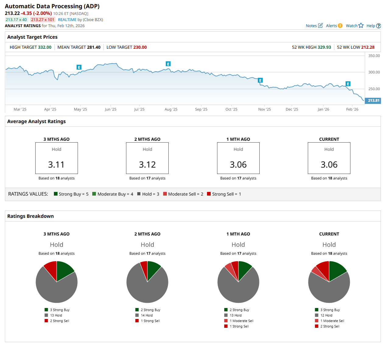 On Feb. 9, Stifel Financial Corp. (SF) analyst David Grossman maintained a “Hold" rating on ADP and lowered its price target to $270, indicating a 26.6% potential upside from the current levels.
