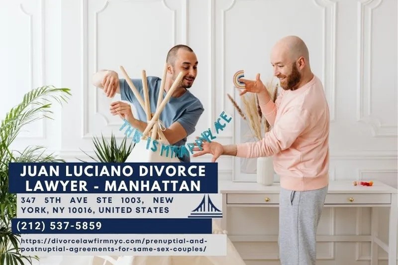 New York, NY - New York LGBTQ divorce attorney Juan Luciano of Juan Luciano Divorce Lawyer (https://divorcelawfirmnyc.com/prenuptial-and-postnuptial-agreements-for-same-sex-couples/) is releasing an in-depth resource on prenuptial and postnuptial agreements tailored to same-sex couples in New York. The guidance addresses statutory formalities, practical safeguards, and family-building considerations under New York law, including the Child-Parent Security Act. Framed for couples seeking durable planning, the material explains how well-drafted agreements can clarify property rights, allocate financial responsibilities, and reinforce long-term protections while aligning with evolving parentage frameworks.