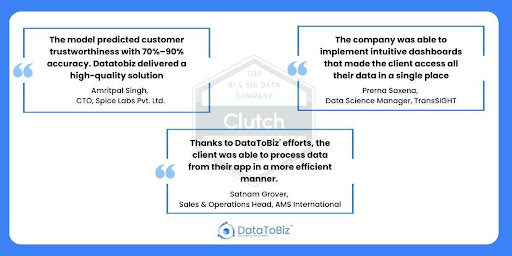 The company has successfully served various enterprises within multiple sectors and is going ahead consistently. Major market players in the states including Tosoh Quartz, FTCSolar, Nordex, Dentsu, TransSIGHT, etc have been implementing DataToBiz’s advanced data analytics, data modeling, and data warehousing solutions. This enabled them to extract actionable insights from their unstructured and big data and make data-driven decisions that positively impact their bottom line and ultimately increase ROI. Under the expertise and partnership of DataToBiz, several companies under various niches were able to: