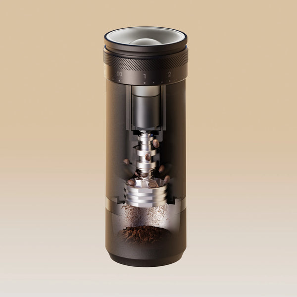 The OutIn Fino features a 38mm 7-blade conical burr, which ensures exceptionally fast and precise grinding of up to 25g of coffee, while a contractable bean hopper ensures smooth and continuous loading. Thanks to the highly precise and evenly distributed grind, the all-new OutIn Fino consistently delivers a delicious and balanced taste.