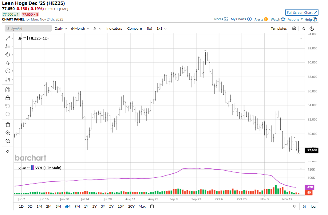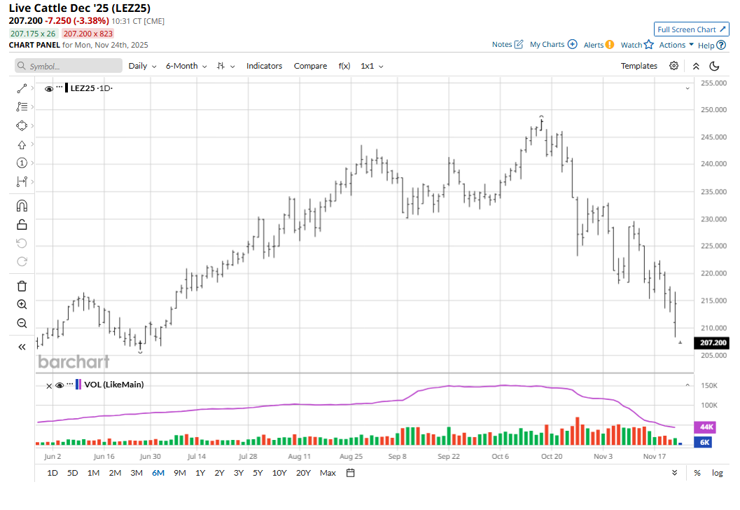 December live cattle (LEZ25) futures hit a 4.5-month low last Friday and for the week lost $4.70 a hundredweight. January feeder cattle (GFF26) futures also notched a 4.5-month low and on the week fell $6.325. December lean hog (HEZ25) futures last week were down 70 cents. Live and feeder cattle futures and lean hog futures markets are all in near-term price downtrends on their daily bar charts, which suggests the path of least resistance for prices will remain sideways or lower for at least the time being.