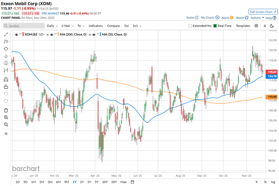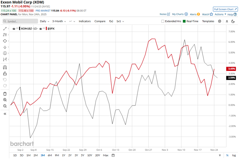 However, shares of the Spring, Texas-based company have fallen 4.9% from its 52-week high of $121.88. Over the past three months, XOM stock has risen 4.2%, which slightly outpaced the broader S&P 500 Index’s ($SPX) return of 4.1% during the same period.