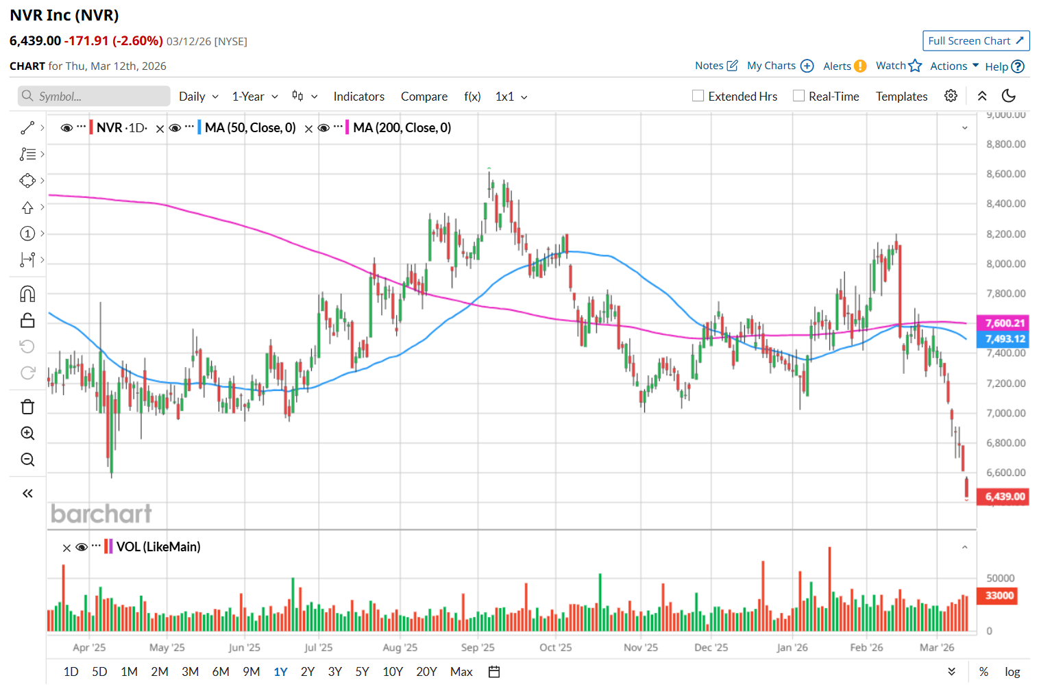 To confirm its bearish trend, NVR has been trading below its 200-day and 50-day moving averages since mid-February.