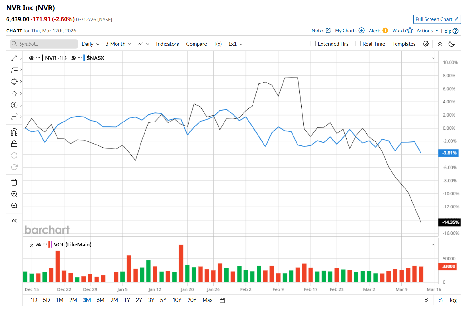This homebuilder has slipped 25.3% from its 52-week high of $8,618.28, reached on Sep. 5, 2025. Shares of NVR have declined 14.4% over the past three months, underperforming the Nasdaq Composite’s ($NASX) 3.8% drop during the same time frame.