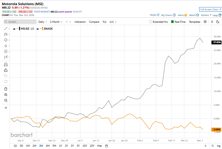 MSI currently trades 2.4% below its 52-week high of $492.22 touched on Sept. 11, 2025. Meanwhile, its shares have surged 27.8% over the past three months, outpacing the Nasdaq Composite’s ($NASX) 4% fall during the same period.