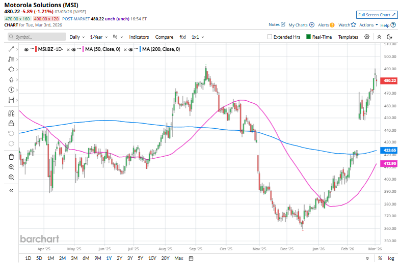 MSI stock climbed above its 50-day moving average in early January and over its 200-day moving average in early February, underscoring its bullish trend.