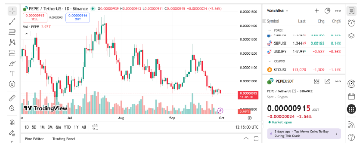Pepe (PEPE) currently trades around $0.000009, down around 13% over seven days. Technical watchers point out that PEPE is holding a support zone near $0.000010, with bulls looking to push toward resistance around $0.000017.