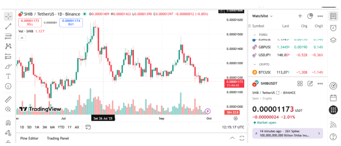 SHIB currently trades near $0.000012 with a 24-hour volume of $175 million. Recent movement shows SHIB down about 5% in a session as broader markets pull back. That said, SHIB faces red flags. Rising exchange balances and whale reductions point to sell pressure looming.