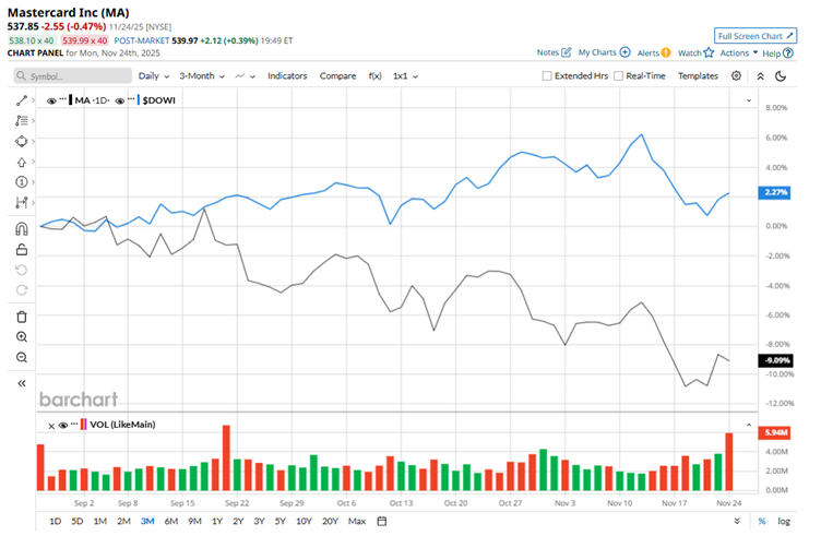 Mastercard may be a powerhouse in the payments world, but its recent stock performance tells a different story. Over the past three months, shares have slid 10.2%, pulling back about 10.6% from its August 52-week high of $601.77. Meanwhile, the Dow Jones Industrial Average ($DOWI) has inched higher by 2.3%, making Mastercard’s slump stand out even more on Wall Street’s scoreboard.
