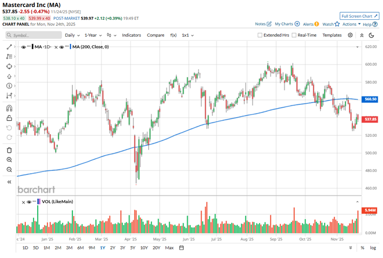 Technical indicators are signaling a sharp momentum shift. After spending much of the year comfortably above the 200-day moving average with some fluctuation in between, Mastercard’s stock has slipped below this key level since late October, a classic warning sign that the trend has flipped from strength to sudden weakness.