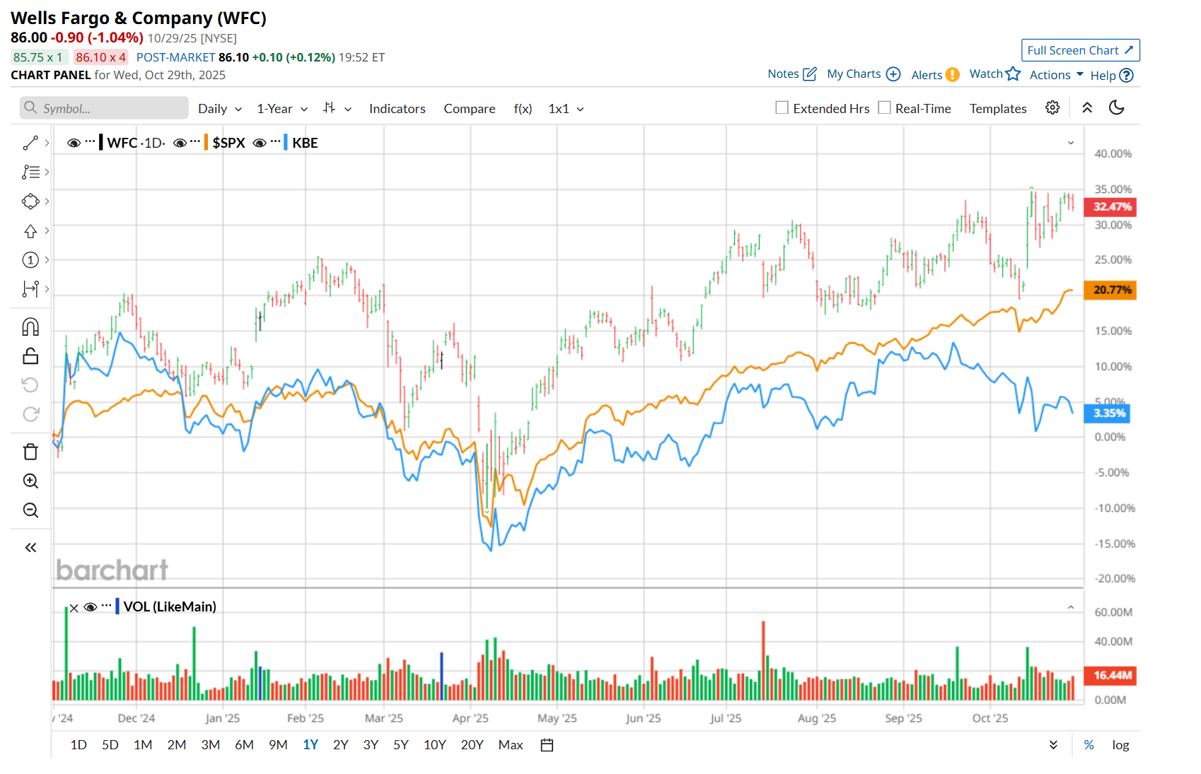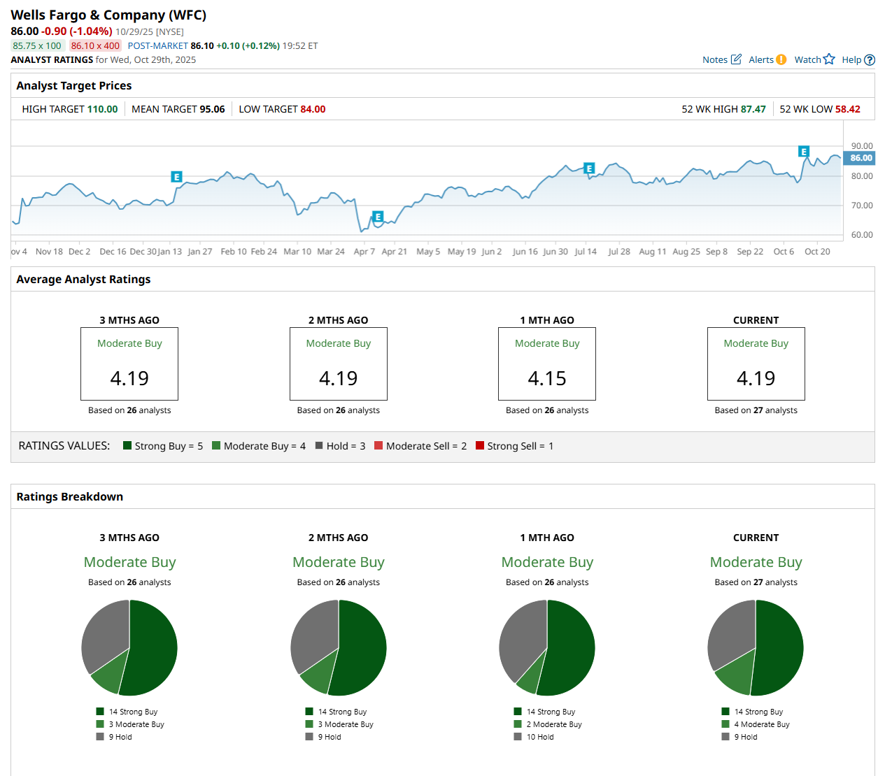 On Oct. 24, Gerard Cassidy from RBC Capital maintained a "Buy" rating on WFC, with a price target of $88, implying a 2.3% potential upside from the current levels.