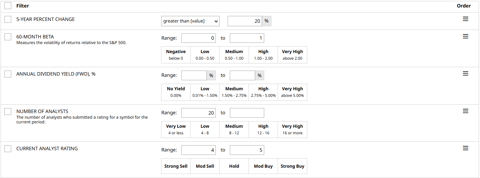 Using Barchart’s free screener tool, I set the following filters: