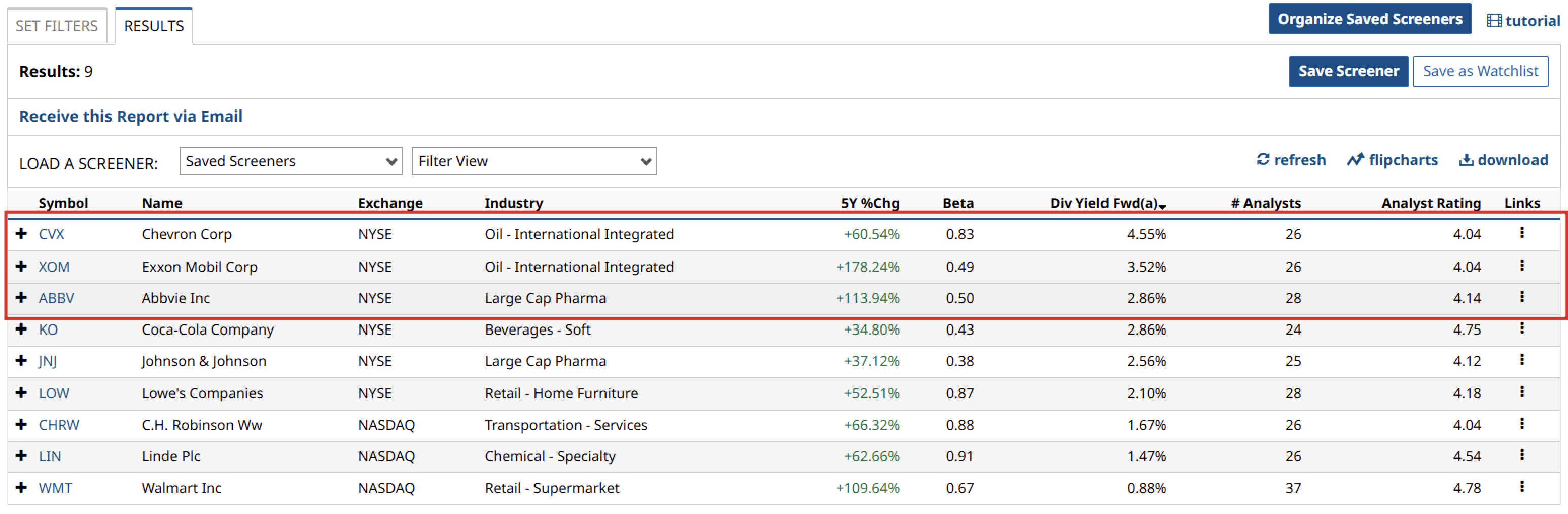 After running the filters, I was left with nine companies. So I sorted the list by clicking the Div Yield Fwd(a) option, and I got my top three highest-yielding and most reliable Dividend Aristocrats.