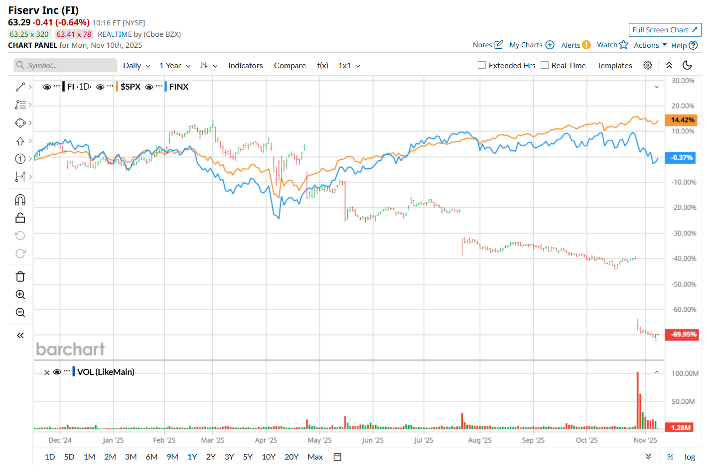 Narrowing the focus, FI has also notably lagged behind the Global X FinTech ETF’s (FINX) 1.8% rise over the past 52 weeks and 3.4% uptick on a YTD basis.