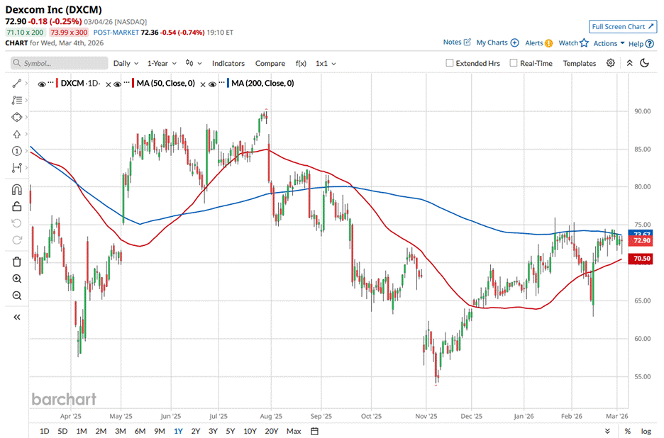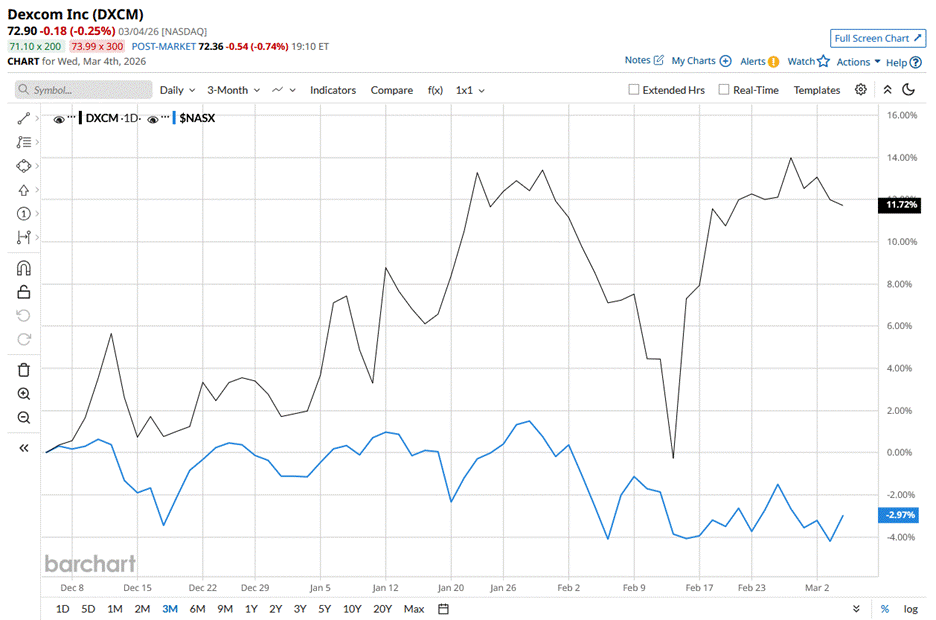 DXCM stock reached its 52-week high of $89.98 on July 30, 2025, and has slipped 19% from that peak. The stock has gained 11.7% over the past three months, notably outperforming the Nasdaq Composite’s ($NASX) 3% slip during the same time frame.