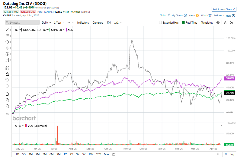 On Apr. 15, Datadog shares surged 8.4% as a broader tech rally pushed the Nasdaq toward record highs, fueled by improving market sentiment amid hopes of easing U.S.-Iran tensions and strong momentum in AI-related developments.