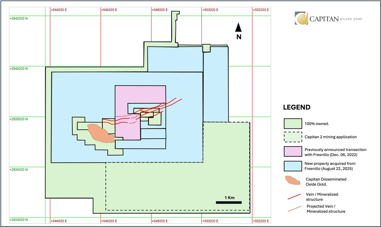The Company's original (2020) property package contained two isolated high-grade silver vein targets, Jésus María and San Rafael, as well as the disseminated gold target (Capitan Hill) to the south of the Jésus María showings. In 2022, Capitan completed its first property acquisition at Cruz de Plata, growing the property by 261.42 hectares and connecting the Jésus María and San Rafael targets, which formed the Jésus María silver trend (See Company press release dated December 6, 2022). On August 22, 2025, the Company announced the acquisition of a key property covering a total surface of 2,171.4 hectares, completing the consolidation of the Cruz de Plata property package (See Figure 1). Prior to the latest acquisition, the Company conducted a detailed mapping and surface sampling program that, together with the newly acquired data from the previous operator, has formed the basis of a new understanding of the controls of the mineral system and the discovery of multiple new targets. Figure 1 below shows the starting and current land position for the Cruz de Plata project.