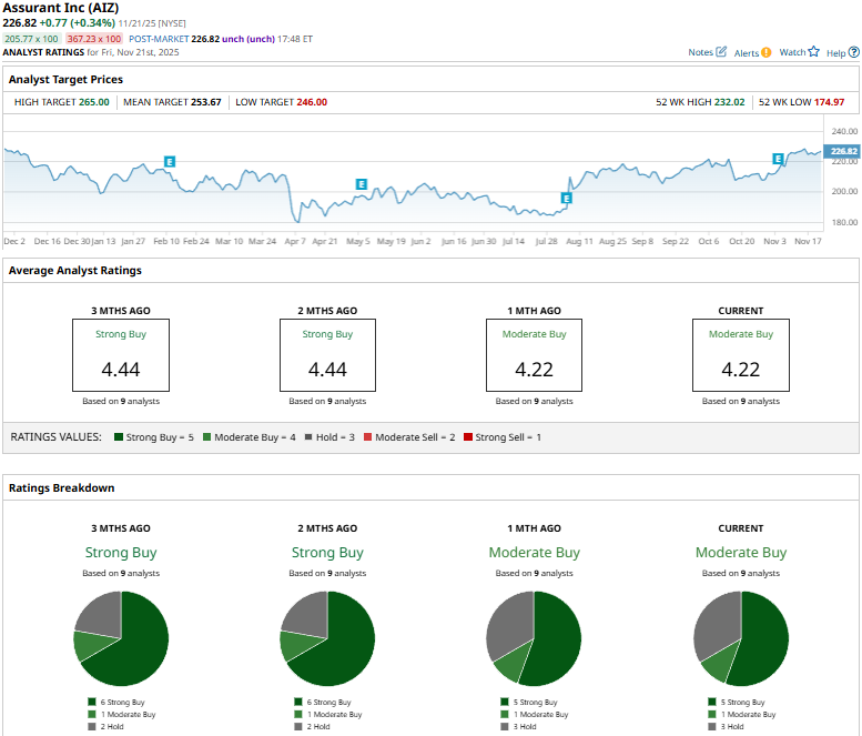 On Nov. 20, Keefe, Bruyette & Woods analyst Tommy McJoynt maintained an “Outperform” rating on AIZ and raised the price target from $248 to $254.
