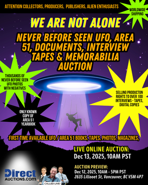 VANCOUVER, BC, December 06, 2025 /24-7PressRelease/ -- A substantial private collection documenting decades of UFO and UAP research will be available through an online auction on Saturday, December 13, 2025. Direct Auctions will present the professional archive of Chris Wyatt, an Emmy Award-winning television producer whose work includes UFOs Above & Beyond, Close Encounters: Proof of Alien Contact, UFOs: The Real X-Files, and UFOs: Top Secret.
