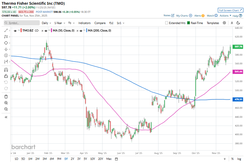 TMO stock has been trading above its 50-day and 200-day moving averages since early October, indicating a recent uptrend.