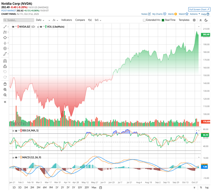 Shares of the AI chip maker have been on a relentless run this year – up 45.4% year-to-date (YTD) and soaring 71.5% over the past six months alone, cementing its place among Wall Street’s strongest momentum plays. The stock crossed above the $200 mark on Oct. 28, and notched a fresh high of $212.19 on Oct. 29, marking yet another milestone in its rally.