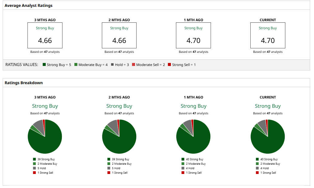 Overall, analysts are bullish about NVDA’s growth prospects, giving the stock a consensus rating of “Strong Buy.” Of the 47 analysts covering the stock, 40 advise a “Strong Buy,” while two suggest “Moderate Buy,” four advise a “Hold,” and only one suggests a “Strong Sell.”
