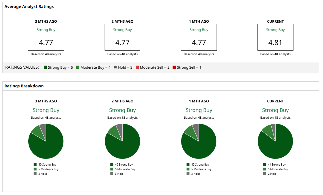 Out of 48 analysts, 41 recommend “Strong Buy,” five lean toward “Moderate Buy,” and two suggest to “Hold” onto the stock.