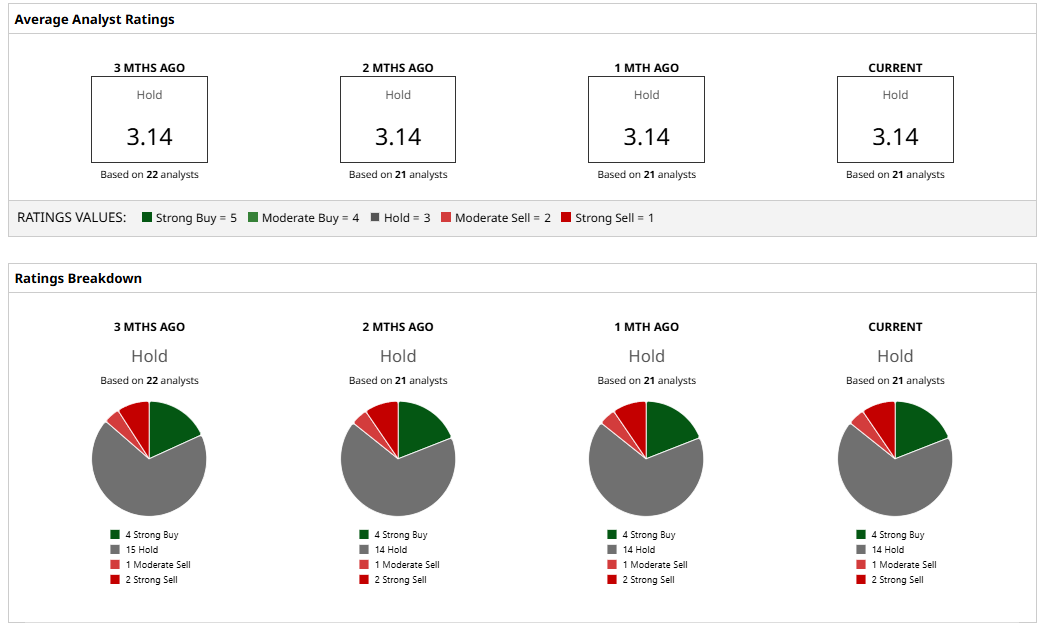 PLTR has a consensus rating of a “Hold” overall. Of the 21 analysts covering the stock, four advise a “Strong Buy,” 14 suggest a “Hold,” one analyst gives it a “Moderate Sell” rating, and two rate it as a “Strong Sell.”