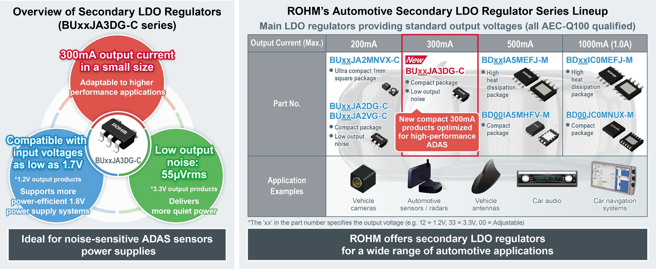 Santa Clara, CA and Kyoto, Japan, Oct. 25, 2022 (GLOBE NEWSWIRE) -- ROHM Semiconductor today introduced the new BUxxJA3DG-C series of automotive-grade LDO regulator ICs (BU12JA3DG-C, BU15JA3DG-C, BU18JA3DG-C, BU25JA3DG-C, BU30JA3DG-C, BU33JA3DG-C). The devices are designed for automotive applications, such as sensors for ADAS (Advanced Driver Assistance Systems) which have become smaller and more powerful.