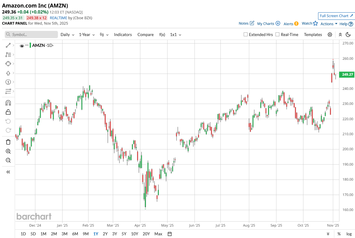 Amazon, the global e-commerce company with a market cap of $2.6 trillion, offers cloud infrastructure, online retail, advertising, and subscription services to customers and businesses worldwide. Its market price is $249, with a year-to-date (YTD) gain of 13.56% and a 52-week performance of 24.88%.