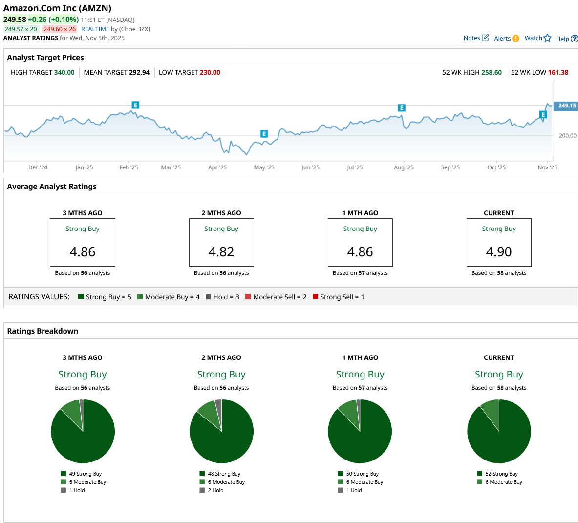 Confidence across the analyst community remains strong. The 58 experts tracked give AMZN stock a consensus “Strong Buy” rating. Every analyst gives it either a “Strong Buy” or “Moderate Buy” rating, with notably zero holds or sells. The average price target is $292.94. With the stock at $249 now, that’s a projected upside of roughly 17%.