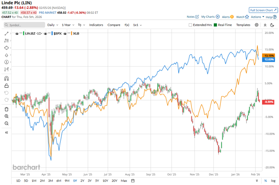 Shares of Linde fell 2.9% on Feb. 5 after the release of its Q4 2025 results, as reported net income down 11% year-over-year and EPS falling 9% to $3.26. Adjusted operating profit margin declined 40 basis points year-over-year to 29.5%, and EMEA underlying sales fell 2% due to a 3% volume decline, raising concerns about regional demand softness.