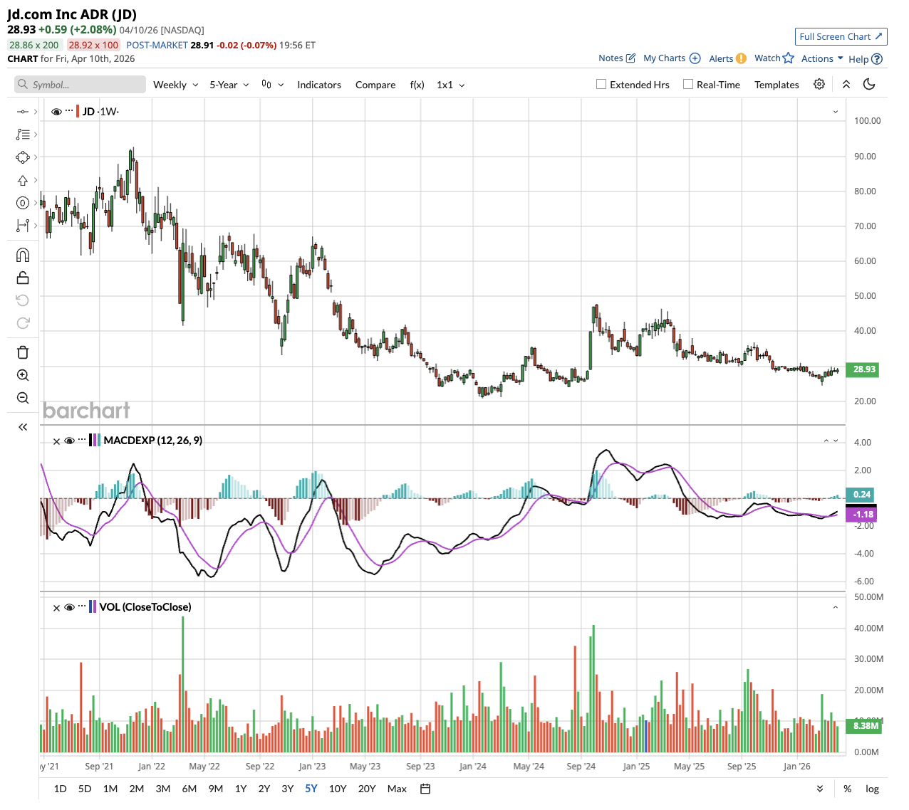 Burry told his Substack subscribers that JD represents "a significant add" to his portfolio, with the position now slightly above 6% of his holdings. Alibaba was also described as a new position at just over 6%. JD.com stock has pulled back and is trading 24% below its 52-week high, making it attractive to Burry.