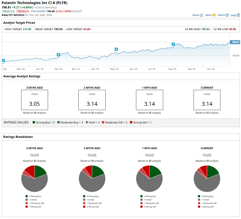 While Palantir’s business fundamentals appear promising, Wall Street remains cautious heading into the company’s third-quarter earnings report. The main concern lies in Palantir’s steep valuation. PLTR trades at a price-sales ratio of about 156.8 times, an exceptionally high level compared to industry peers.