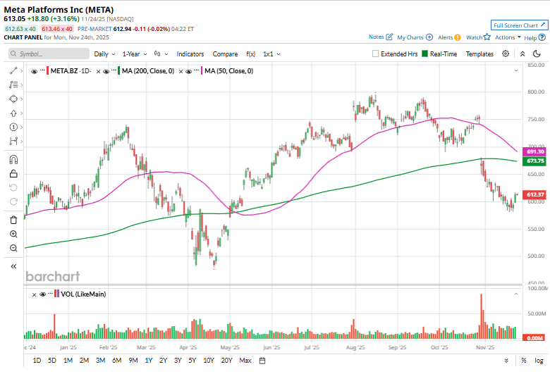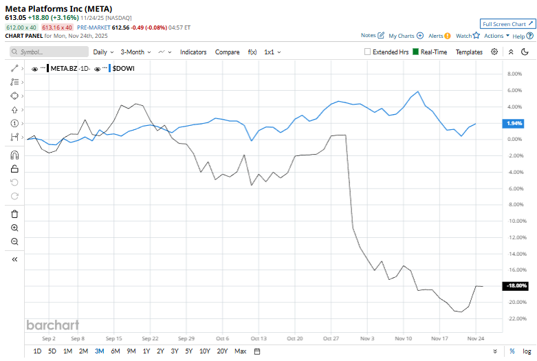 Despite the notable strengths, the social media giant touched its 52-week high of $796.25 on Aug. 15 and is currently trading 23% below the peak. Over the past three months, shares of META have declined 18.8%, underperforming the broader Dow Jones Industrial Average’s ($DOWI) 1.9% rise over the same time frame.