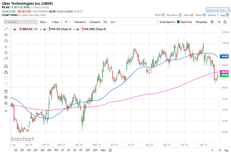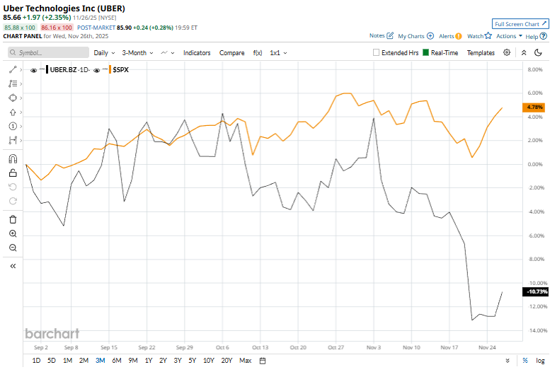 However, shares of the company have dipped 16% from its 52-week high of $101.99 touched on Sept. 22. Over the past three months, shares of Uber Technologies have decreased 11.3%, trailing the S&P 500 Index ($SPX) 5.4% surge during the same period.