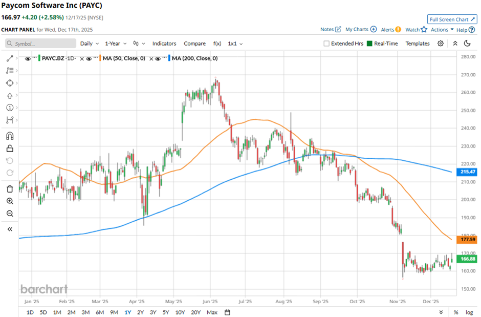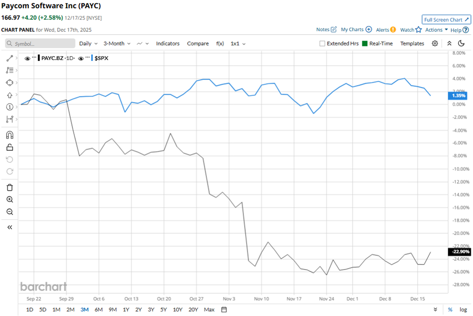 Shares of the Oklahoma City, Oklahoma-based company have fallen 37.6% from its 52-week high of $267.76. Paycom Software’s shares have decreased 22.2% over the past three months, lagging behind the broader S&P 500 Index’s ($SPX) 1.8% gain over the same time frame.